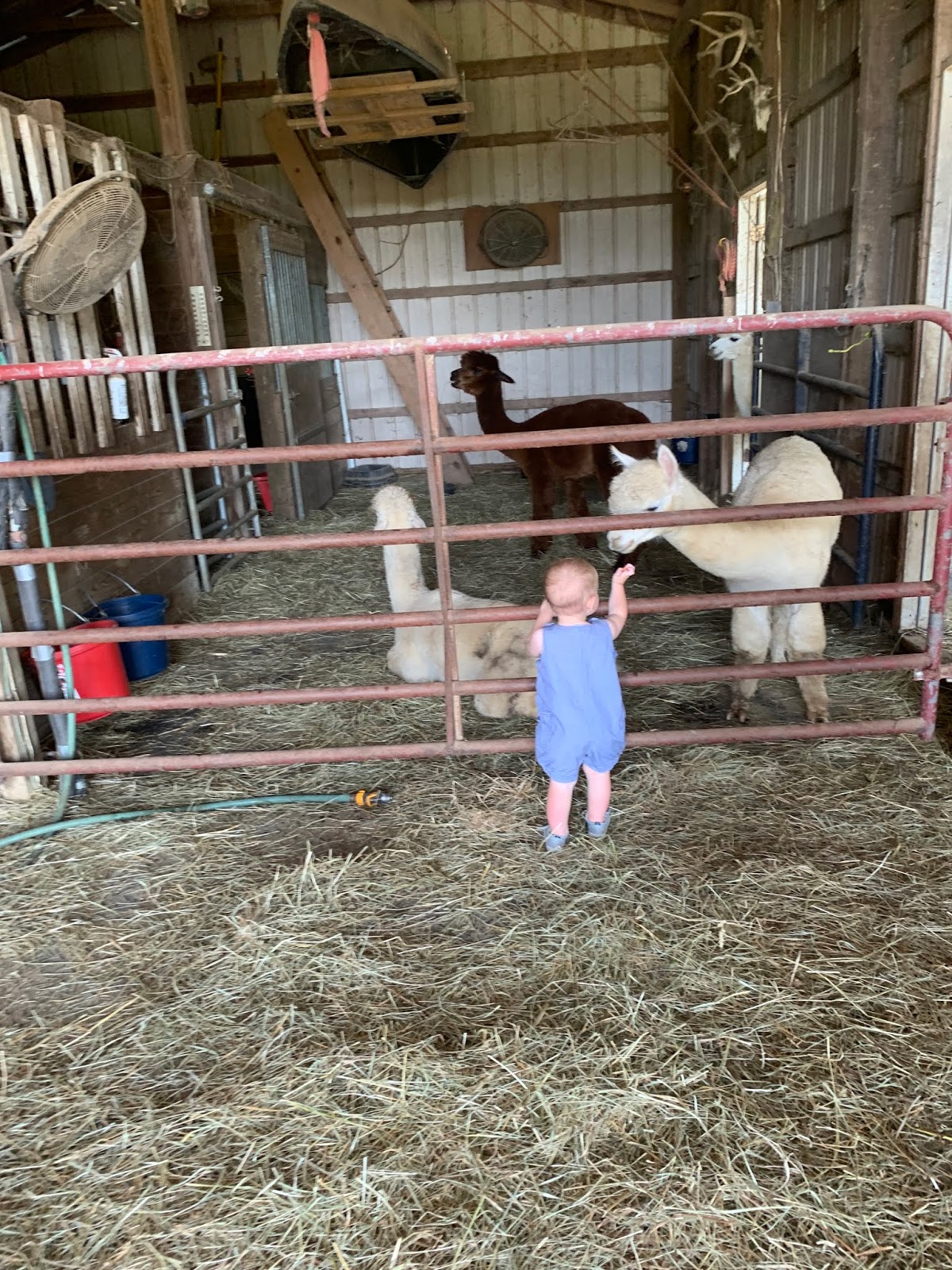 Alpaca Paradise is in Goshen, Ohio about 30 or so minutes from downtown Cincinnati. It was a little bit of a hike, but it was well worth the drive. Katie and Q drove with us. When we got there, we were greeted by a small house with green pastures behind it. Anne greeted us and the babies, and she took us back to meet her alpacas.